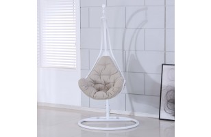 Balancelle blanche suspendue en forme d’oeuf. Cette balancelle vous donnera la sensation d’être dans votre bulle et vous fera passer de très agréables moments, à lire un livre, boire un jus de fruit ou tout simplement profiter du beau temps niché dans votre cocon.