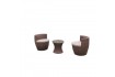 Lot de 3 pièces de mobilier en résine tressée comprenant 3 chaises avec coussins en éponge et une table ronde en verre clair.